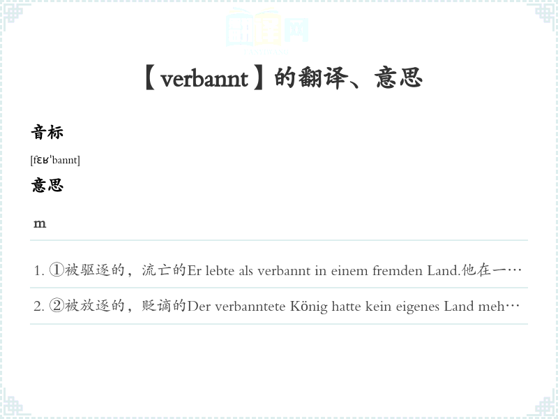 ①被驱逐的,流亡的Er lebte als verbannt in einem fremden Land.他在一个外国生活,成为流亡者。
