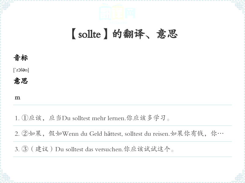 ①应该,应当Du solltest mehr lernen.你应该多学习。