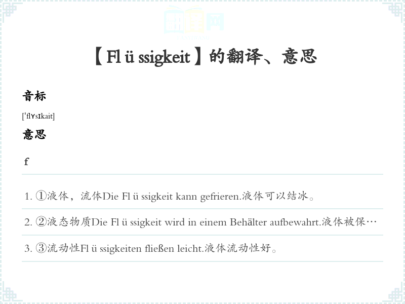 ①液体,流体Die Flüssigkeit kann gefrieren.液体可以结冰。