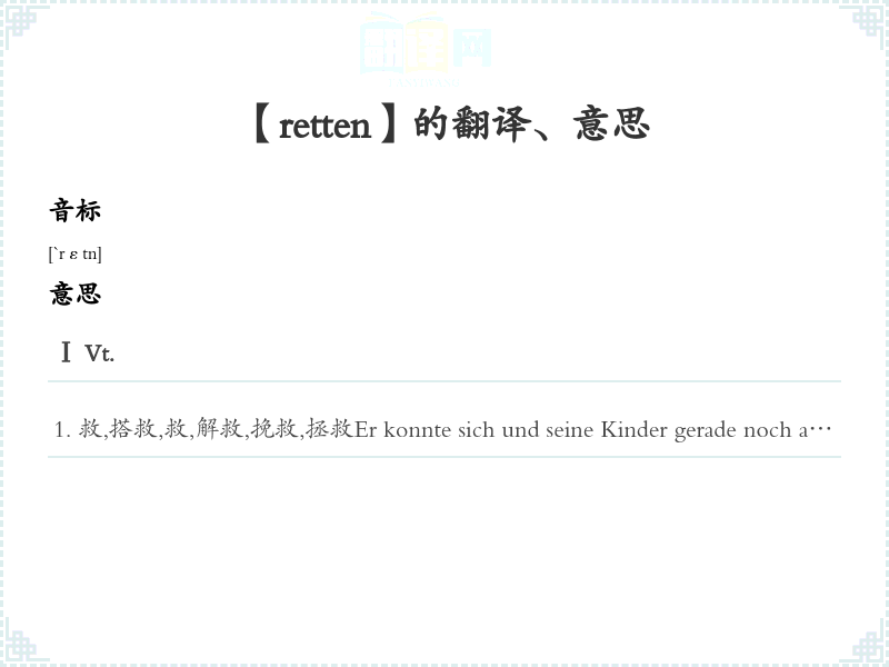 救,搭救,救,解救,挽救,拯救Er konnte sich und seine Kinder gerade noch aus dem brennenden Haus retten.他勉强从燃烧的房子中逃出并把自己的孩子也救了出来。Er konnte im Krieg seinen Besitz nicht mehr retten.战争中他无法救自己的财产。Ⅱ Vr.逃跑,逃脱,躲避语法搭配+, sich+, von+, gegen+, aus+, vor+