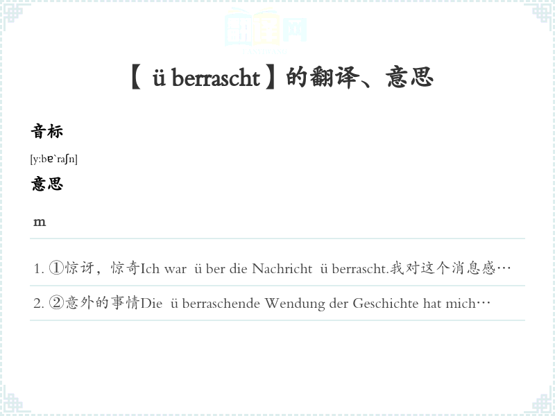 ①惊讶,惊奇Ich war über die Nachricht überrascht.我对这个消息感到惊讶。