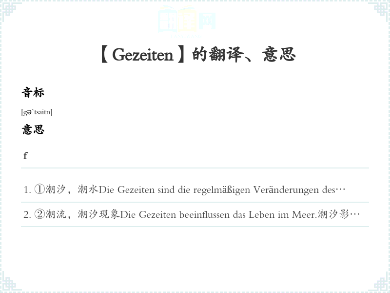 ②潮流,潮汐现象Die Gezeiten beeinflussen das Leben im Meer.潮汐影响着海洋生物的生活。