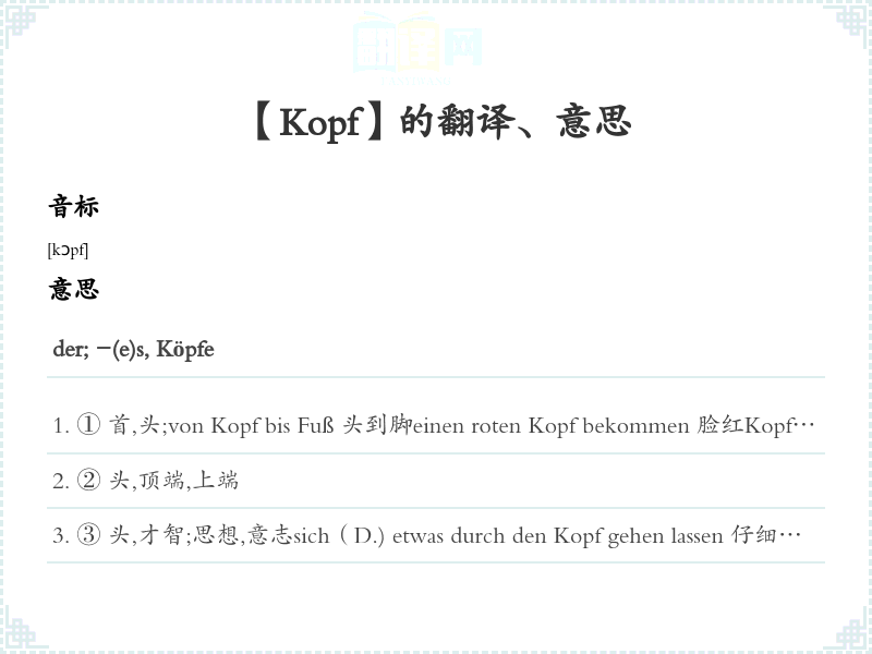 ③ 头,才智;思想,意志sich(D.) etwas durch den Kopf gehen lassen 仔细考虑sich(D.) über A. den Kopf zerbrechen [口]绞尽汁seinen Kopf durchsetzen 有他的方式sich(D.) etwas aus dem Kopf schlagen 忘了某事sich(D.) in den Kopf setzen, etwas zu tun 记住做某事