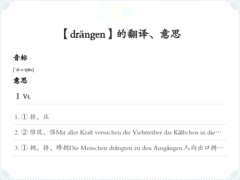 drängend P.Ⅰ 紧迫,迫切gedrängt P.Ⅱ 紧密,密集,简练语法搭配sich+四格, +四格, in+四格, zu+三格, auf+四格, um+四格, gegen+四格