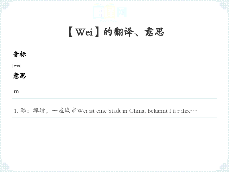 潍:潍坊,一座城市Wei ist eine Stadt in China, bekannt für ihre Windkraftanlagen.潍坊的特产有很多,比如风筝和花生。Die Spezialitäten von Weifang sind vielfältig, wie zum Beispiel Drachen und Erdnüsse.