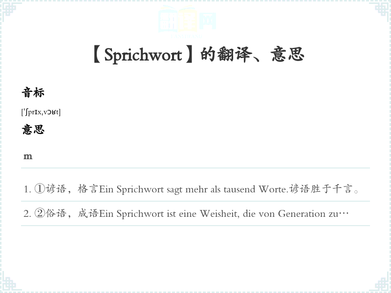 ①谚语,格言Ein Sprichwort sagt mehr als tausend Worte.谚语胜于千言。