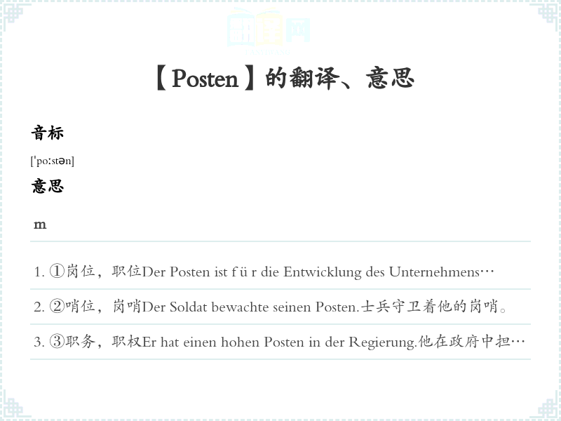 ①岗位,职位Der Posten ist für die Entwicklung des Unternehmens wichtig.该岗位对公司的发展至关重要。