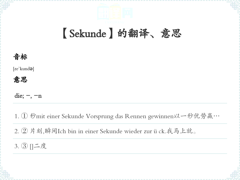 ① 秒mit einer Sekunde Vorsprung das Rennen gewinnen以一秒优势赢得了比赛Es ist jetzt genau 10 Uhr, 31 Minuten und 20 Sekunden.现在准确时间是10点31分20秒。