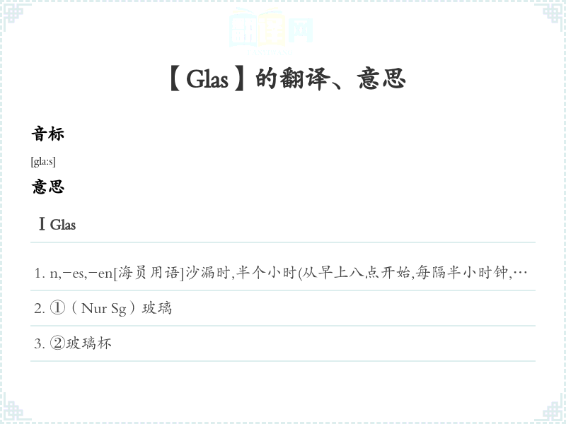 n,-es,-en[海员用语]沙漏时,半个小时(从早上八点开始,每隔半小时钟,如八点半下,九点两下,余类推);半小时钟鸣下ⅡGlasn,-es,Gläser