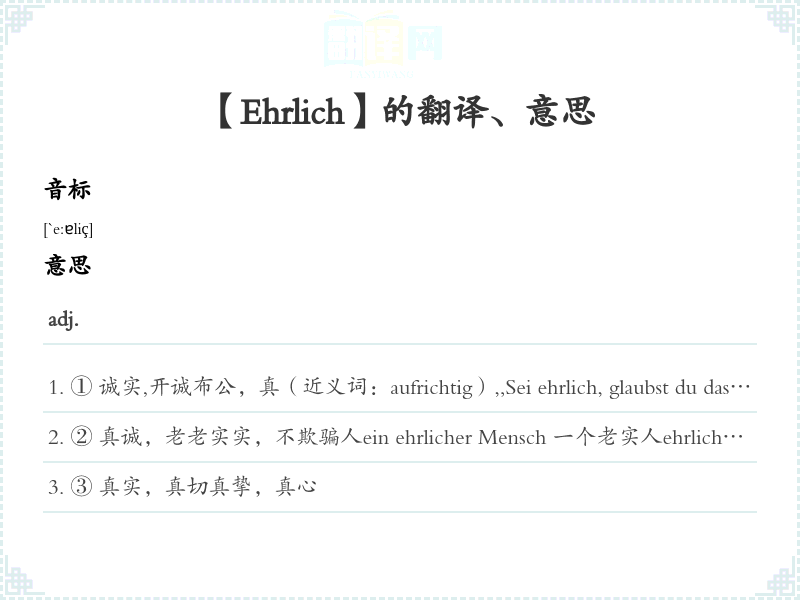 ① 诚实,开诚布公,真(近义词:aufrichtig),,Sei ehrlich, glaubst du das?" - ,,Ehrlich gesagt, nein"真,你信这个?——说实话,我不信。Ich muss ehrlich sagen, ... 我必须坦白地说…