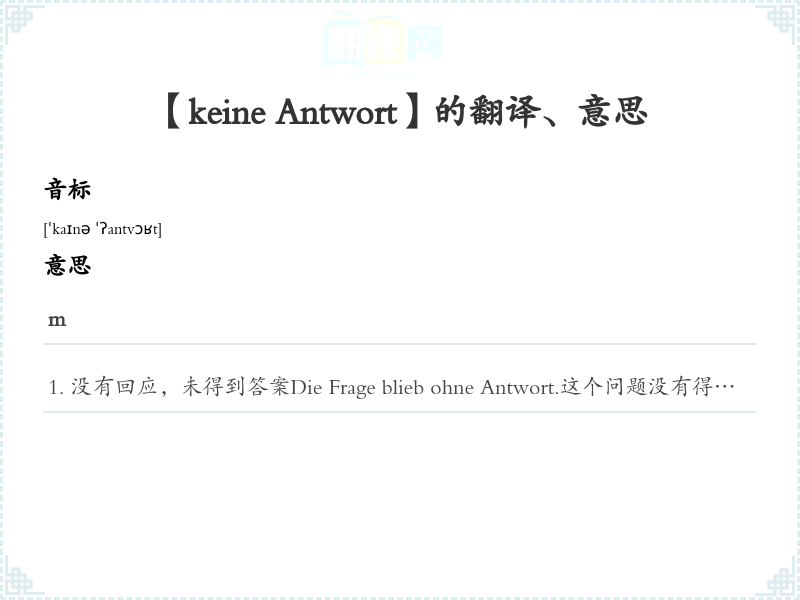 没有回应,未得到答案Die Frage blieb ohne Antwort.这个问题没有得到回应。我没有得到任何答复。Er gab mir keine Antwort auf meine Frage.他没有对我的问题作出回应。