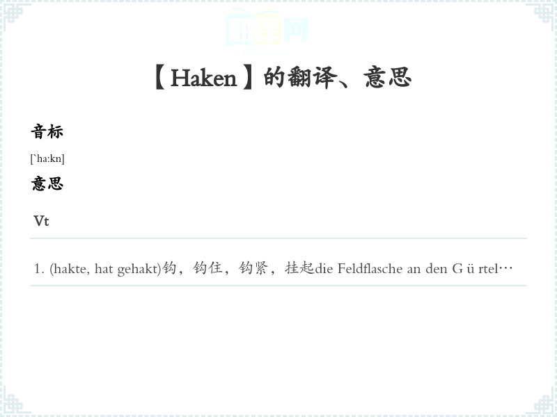 (hakte, hat gehakt)钩,钩住,钩紧,挂起die Feldflasche an den Gürtel haken 把行军水壶挂在腰带Vi(口)钩住,攀牢,挂着Der Schlüssel hakt im Schloß. 钥匙卡在锁眼里了。语法搭配+四格, in+四格, an+四格
