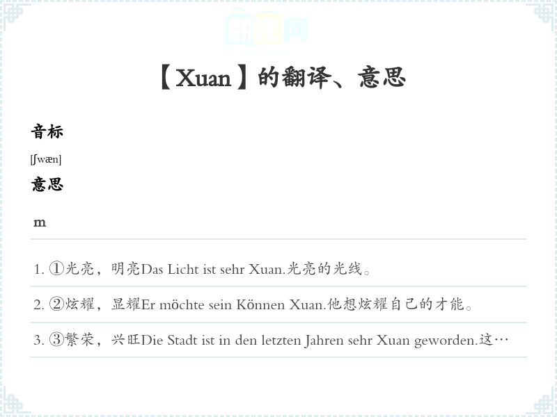 ③繁荣,兴旺Die Stadt ist in den letzten Jahren sehr Xuan geworden.这座城市在最近几年变得非常繁荣。