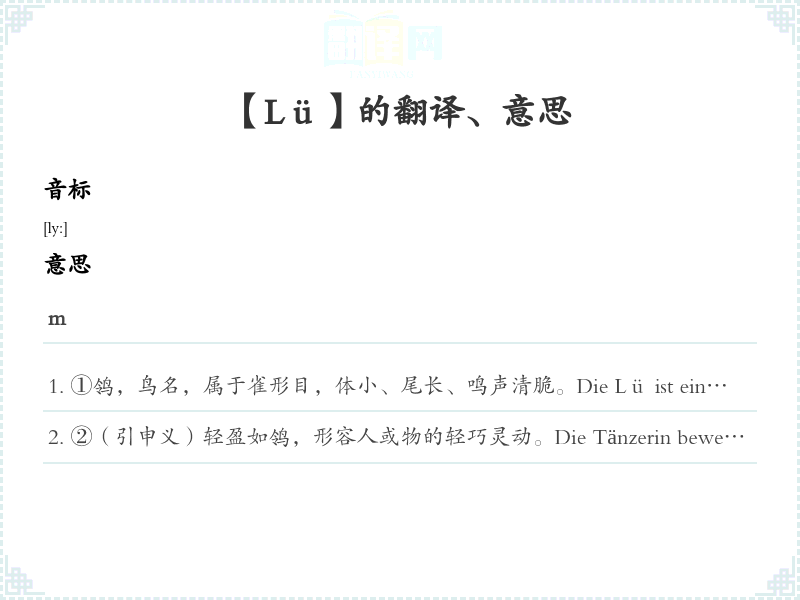 ②(引申义)轻盈如鸰,形容人或物的轻巧灵动。Die Tänzerin bewegte sich so wie eine Lü, leicht und anmutig.