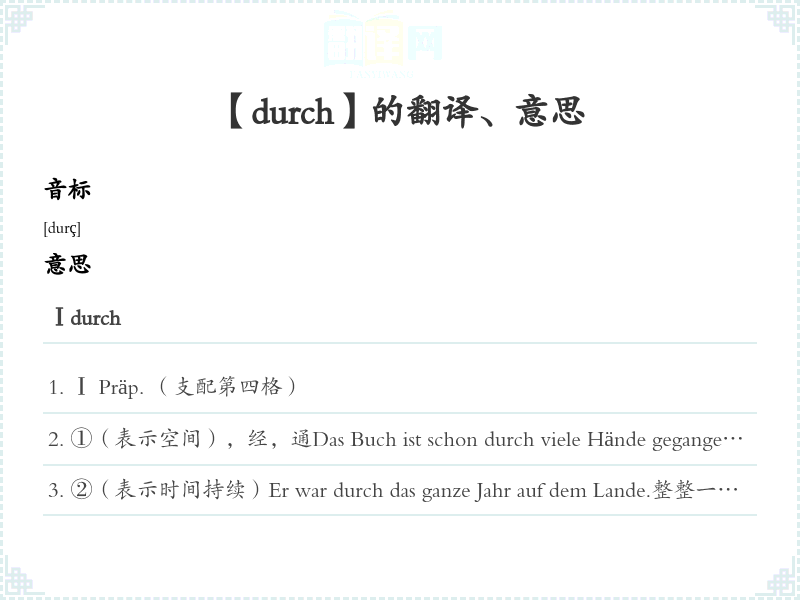 ①(表示空间),经,通Das Buch ist schon durch viele Hände gegangen.这本书已经几易其主了。Der Schuss ging ihm durchs Herz.子弹心脏。