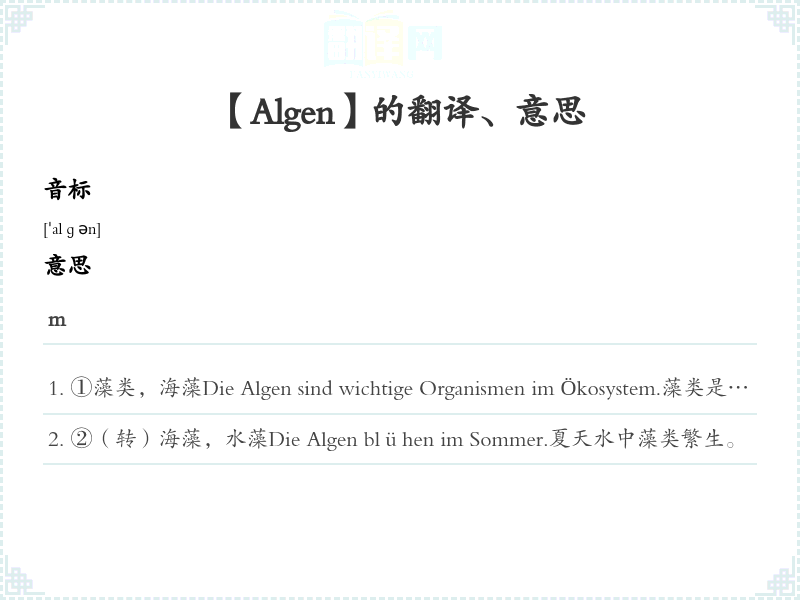①藻类,海藻Die Algen sind wichtige Organismen im Ökosystem.藻类是生态系统中重要的生物。