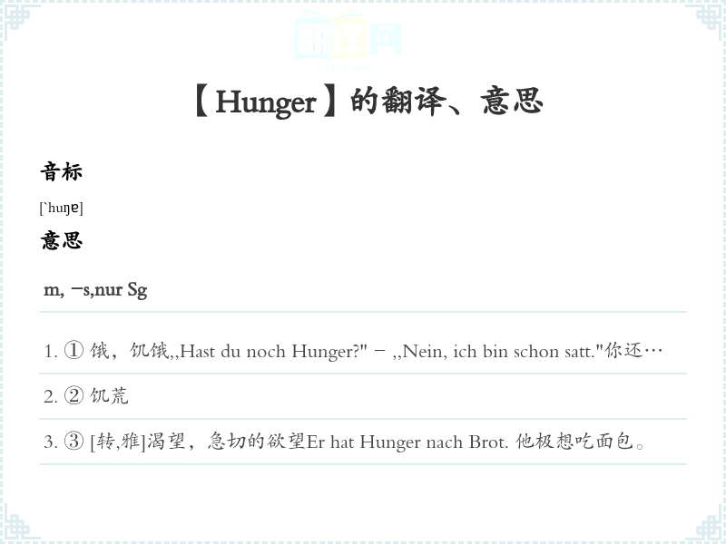 ③ [转,雅]渴望,急切的欲望Er hat Hunger nach Brot. 他极想吃面包。