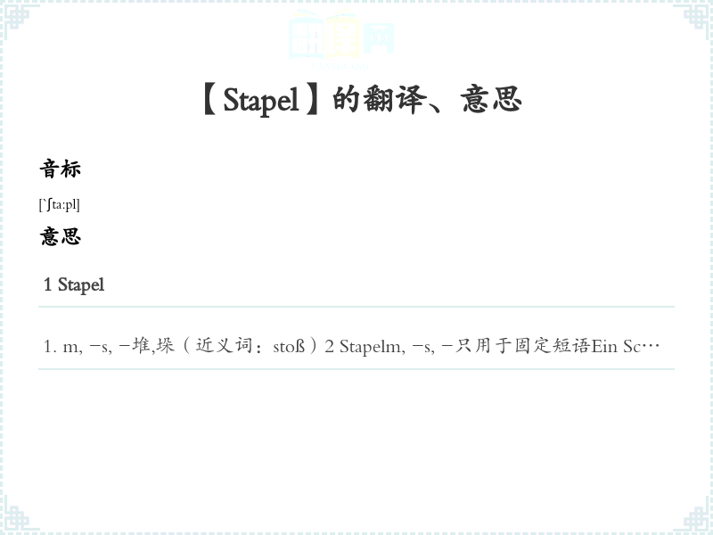 m, -s, -堆,垛(近义词:stoß)2 Stapelm, -s, -只用于固定短语Ein Schiff läuft vom Stapel. 一艘船沉下水。