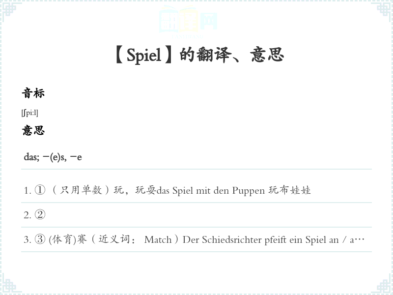 ③ (体育)赛(近义词: Match)Der Schiedsrichter pfeift ein Spiel an / ab, bricht das Spiel ab. 裁判吹哨始,结束,中断赛。Das Spiel steht 1: