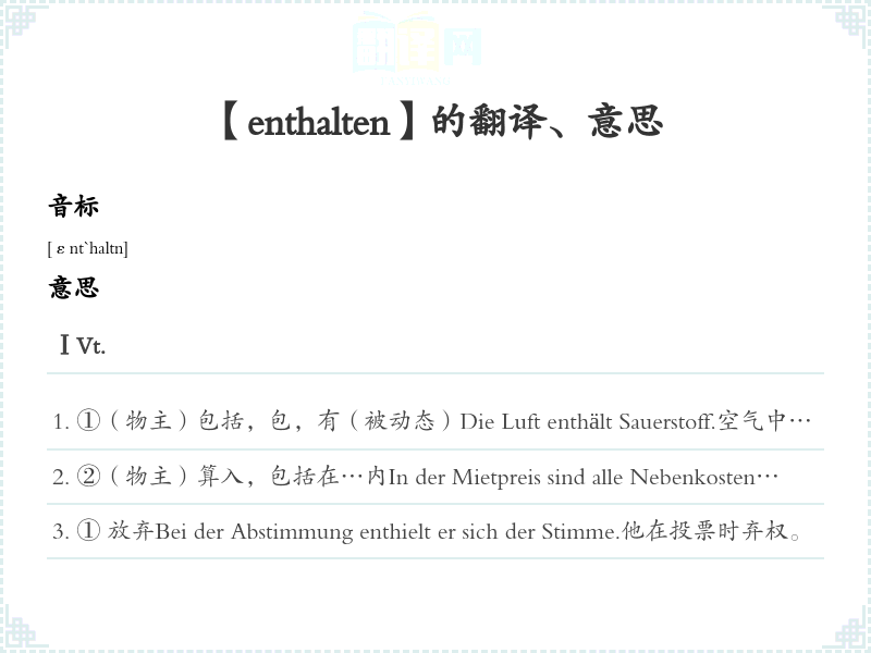 ①(物主)包括,包,有(被动态)Die Luft enthält Sauerstoff.空气中有氧。Das Buch enthält viele gute Abbildungen.这本书有许多好插图。