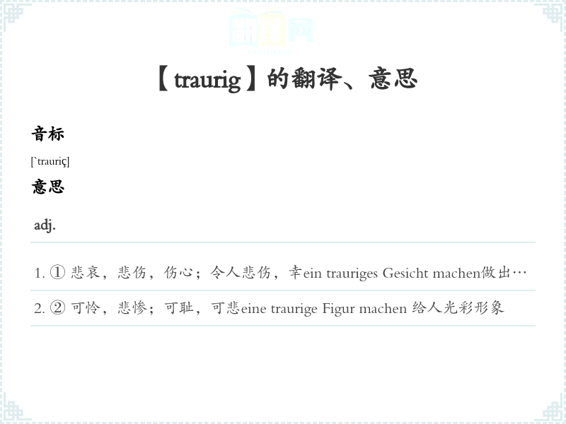 ① 悲哀,悲伤,伤心;令人悲伤,幸ein trauriges Gesicht machen做出副难过样子Bist du traurig darüber, dass wir ihn nicht wieder sehen werden? 你是是因为没见到他感到难过?Es ist traurig, dass du das nicht einsiehst.你没看出这点真遗憾!Das Traurige daran ist, dass ... 令人痛惜是...