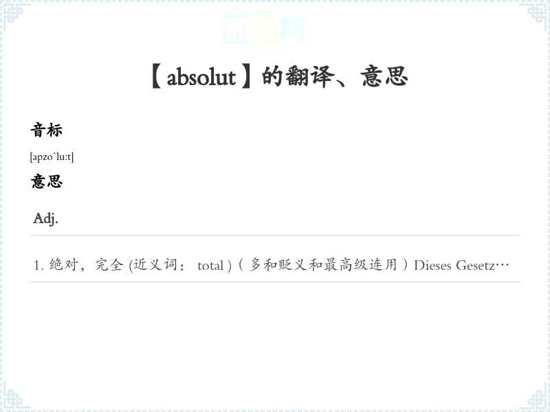 绝对,完全 (近义词: total )(多和贬义和最高级连用)Dieses Gesetz garantiert absolute Glaubensfreiheit.这部法律保障绝对信仰自由。Hier ist absolutes Halteverbot.这里绝对禁止停车。Das hat absolute Priorität.有绝对优先权。Du hast absolut keine Ahnung.你绝对不知道。