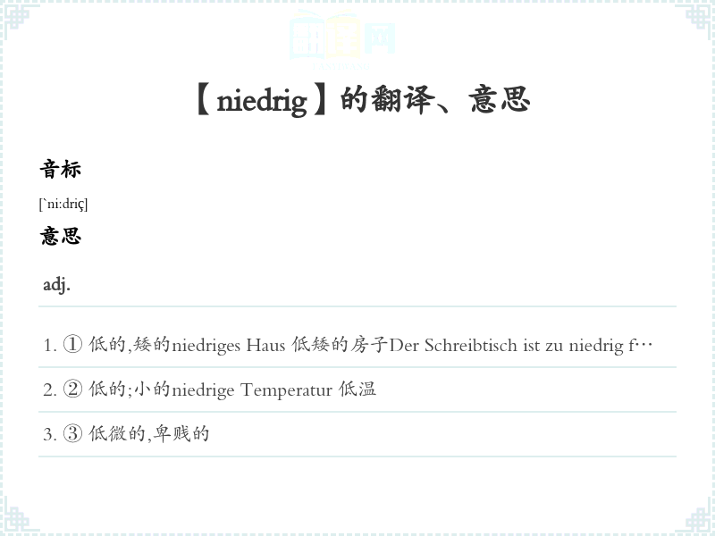 ① 低的,矮的niedriges Haus 低矮的房子Der Schreibtisch ist zu niedrig für mich.这个桌子对太矮了。