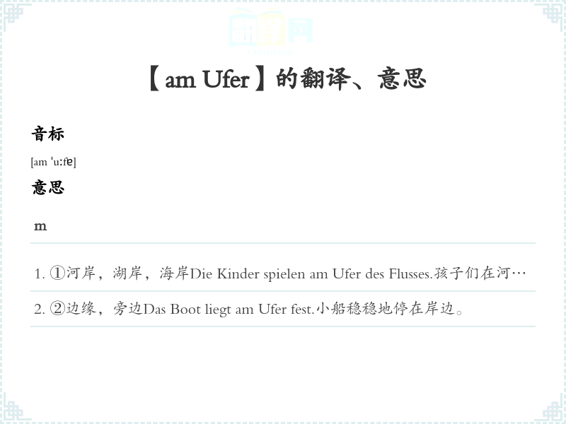 ①河岸,湖岸,海岸Die Kinder spielen am Ufer des Flusses.孩子们在河边玩。