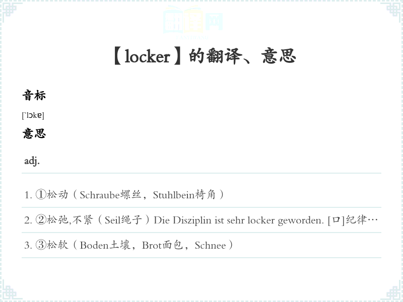 ②松弛,不紧(Seil绳子)Die Disziplin ist sehr locker geworden. [口]纪律变得很松弛。