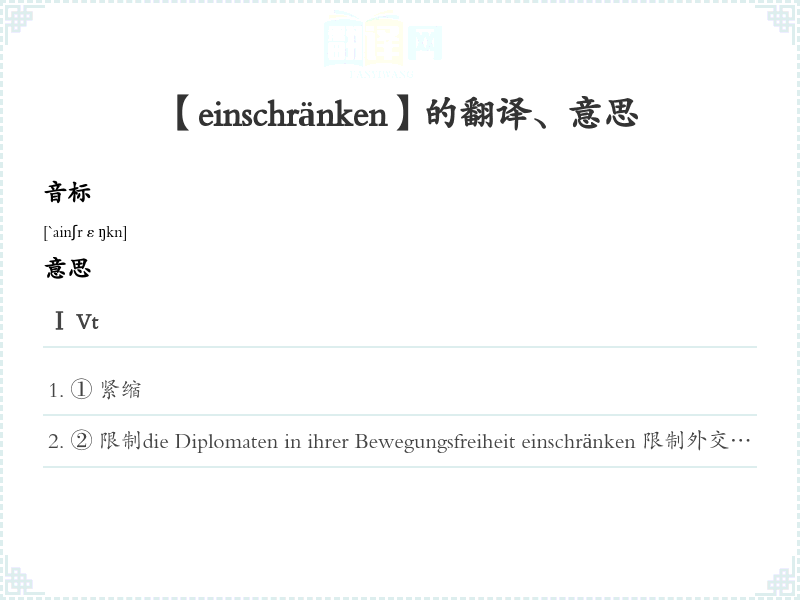 ② 限制die Diplomaten in ihrer Bewegungsfreiheit einschränken 限制外交人的活动自由Ⅱ VrIch muss mich sehr einschränken. 必须非常。eingeschränkt ( in eingeschränkten Verhältnissen) leben 过紧日子语法搭配sich+四格, +四格, in+三格, in+四格, bei+三格