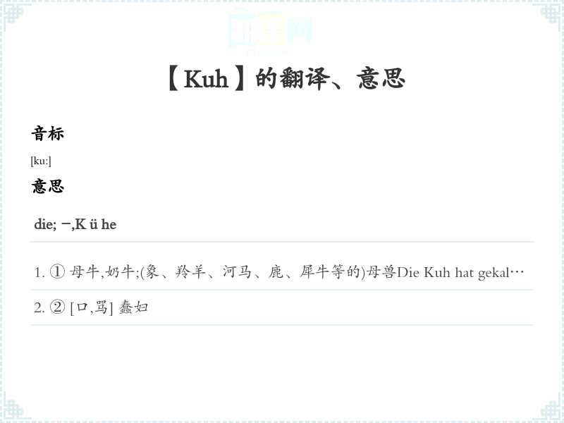 ① 母牛,奶牛;(象、羚羊、河马、鹿、犀牛等的)母兽Die Kuh hat gekalbt. 母牛产犊了。eine Kuh melken 挤牛奶melkende Kuh 奶牛/获利的生意