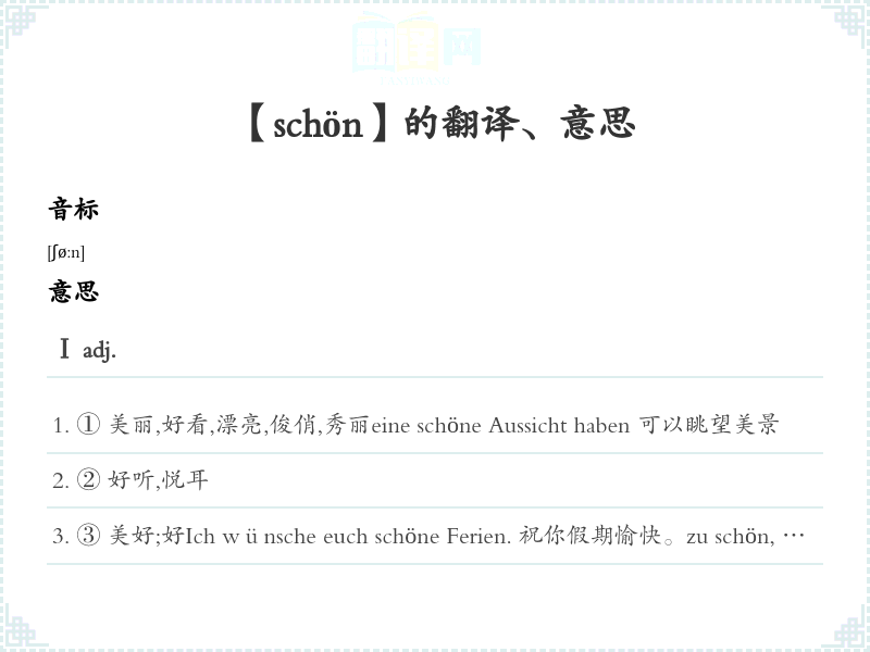 ③ 美好;好Ich wünsche euch schöne Ferien. 祝你假期愉快。zu schön, um wahr zu sein 好令人不能相信