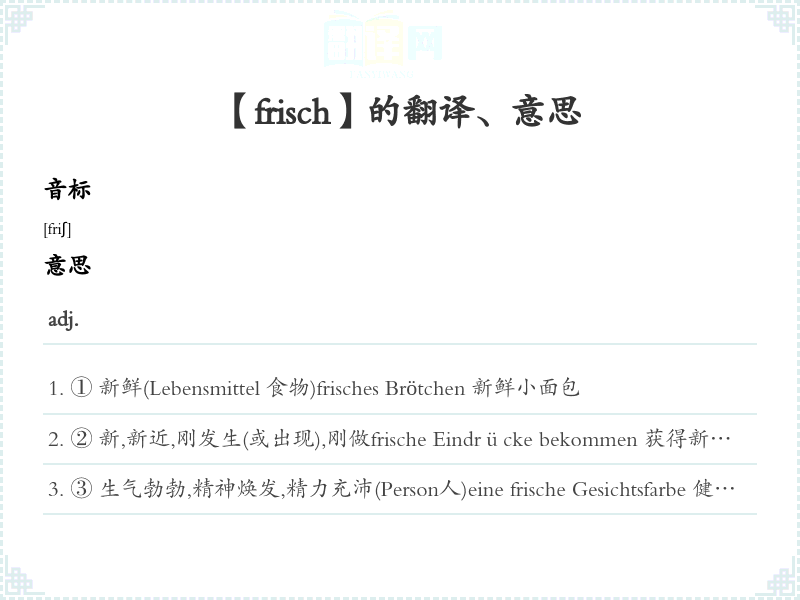 ③ 生气勃勃,精神焕发,精力充沛(Person人)eine frische Gesichtsfarbe 健康面色Wollen Sie sich frisch machen? 您要洗一洗吗?(指洗脸、洗澡等)