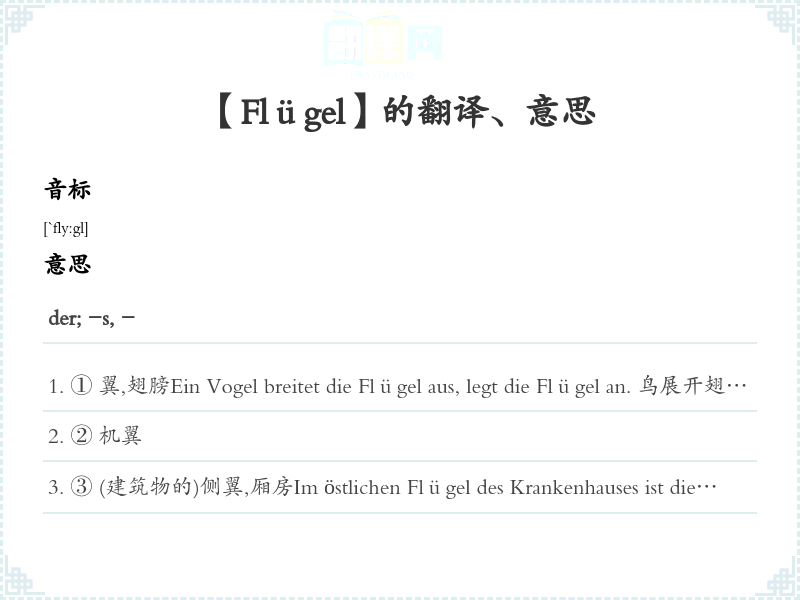 ① 翼,翅膀Ein Vogel breitet die Flügel aus, legt die Flügel an. 鸟展开翅膀,收拢翅膀。