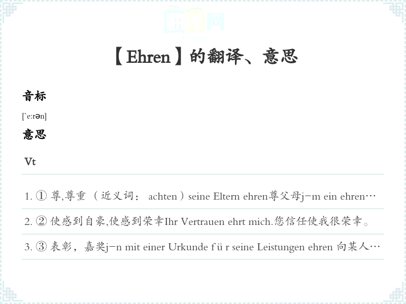 ① 尊,尊重 (近义词: achten)seine Eltern ehren尊父母j-m ein ehrendes Andenken bewahren 崇情缅某人