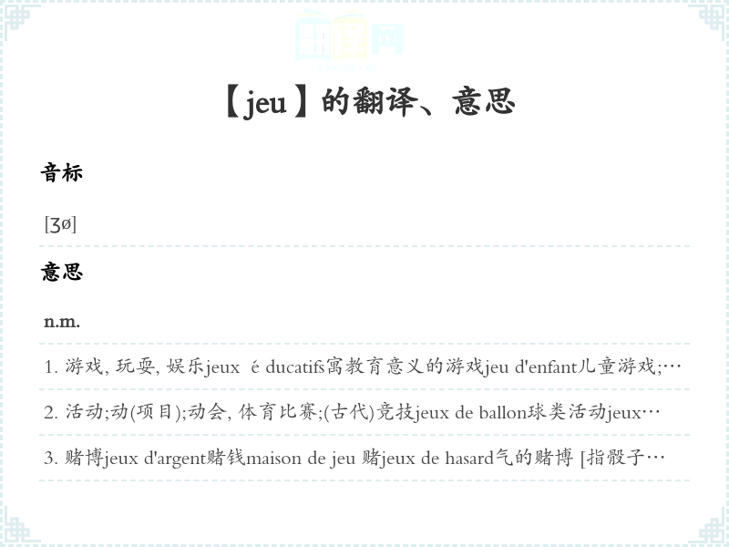 游戏, 玩耍, 娱乐jeux éducatifs寓教育意义的游戏jeu d'enfant儿童游戏;〈转义〉极容易的事, 无足轻重的事Ce n'est qu'un jeu pour lui.这对他来说易如反掌。jeu d'esprit趣味游戏un simple jeu d'esprit〈转义〉诙谐, 玩笑jeu de groupe集体游戏jeux intellectuels智力游戏jeux électroniques电子游戏jeu de mots文字游戏 [如双关、谐音]jeux de main(s)拍打游戏Jeux de mains, jeux de vilains.〈谚语〉打着玩最后总会闹成真打。jeux de société室内游戏 [如猜谜、跳棋等]règle du jeu 游戏规则jeux de prince〈旧语,旧义〉建筑在别人痛苦上的玩乐jeu du destin [de la fortune]命的播弄jeu d'écritures记账par jeu 出于好玩se faire un jeu des difficultés易如反掌地克服困难Je me fais un jeu d'y arriver.我轻而易举就能办到。