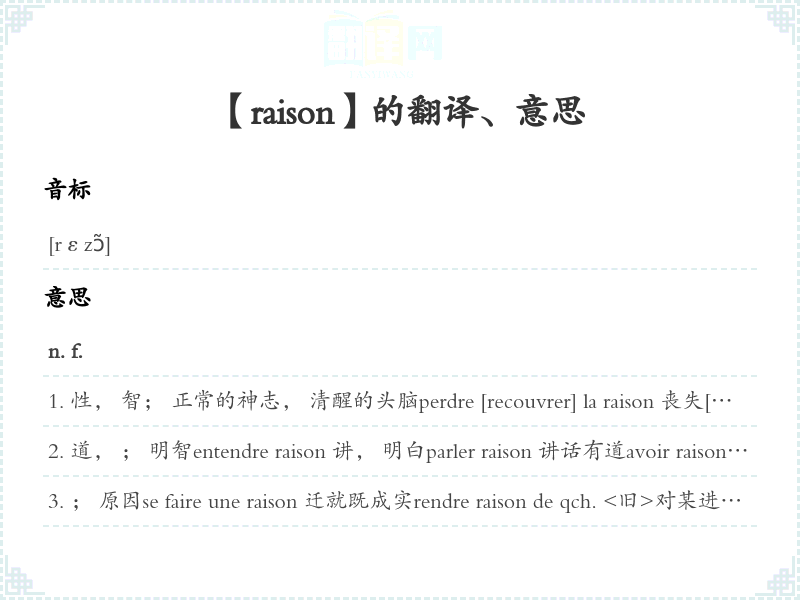 【raison】 联想:、 名词变化:、 形容词变化:、 副词变化:、 近义词:、 义词: 联想词