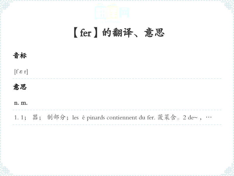 1; 器; 制部分;les épinards contiennent du fer. 菠菜含。2 de~ , 钢, 结实, 有力, 坚定, 坚硬, 固执3器具, 武器等制或金属部分4制器具fer à repasser 熨斗fer à friser 烫发钳5钢筋, 型钢; 型材fer en U 槽6剑, 花式剑7 pl. <旧>产钳8鱼钩9蹄un fer à cheval 马蹄10 pl. 镣铐, 锁链; <书>奴隶, 被奴役书>旧>