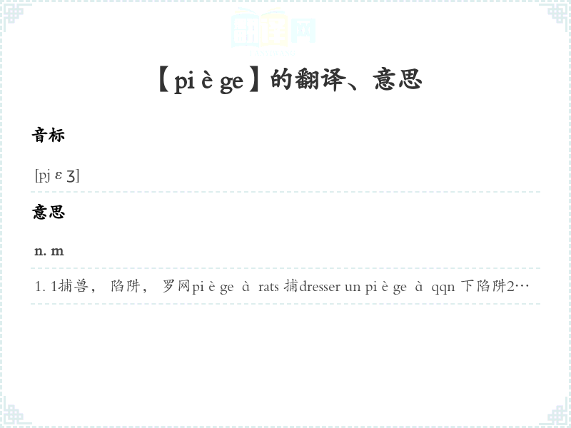 1捕兽, 陷阱, 罗网piège à rats 捕dresser un piège à qqn 下陷阱2<转>圈套, 埋伏, 诡计il est tombé dans le piège 他上了圈套3<转>容易使人搞错的难点dictée pleine de pièges 难点很多的听写4~à ions离子陷阱转>转>