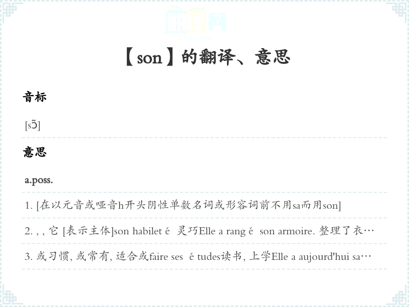 对或, 关或 [表示客体]à sa vue 在看来,从角度n.m.音, 声音son aigu 尖音équipe du son 录音组ingénieur du son 录音师mur du son 【物理学】音障sons musicaux 乐音son nasal【语言】鼻音spectacle 《son et lumière》“声光”表演 [晚上在名胜古迹用变幻灯光照明, 配以有音乐、效果广播, 使人如处历史环境]vitesse du son 【物理学】声速annoncer qch. à son de trompe〈口语〉大声宣布某事baisser le son d'un poste 减低收音机音量émettre un son 发出一个音ne plus pouvoir émettre un son 〈口语〉目瞪口呆, 张口结舌entendre un autre son de cloche〈口语〉听到另外一种说法或意见être un tout autre son de cloche〈口语〉是另一种完全不同说法或意见filer un son (用乐器)拉出一个音au son de, aux sons de 随着…乐声Qui n'entend qu'une cloche n'entend qu'un son. 〈谚语〉兼听则明, 偏听则暗。n.m.