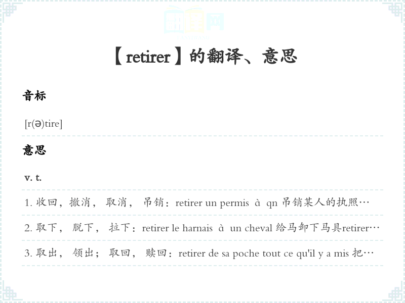 收回,撤消, 取消, 吊销:retirer un permis à qn 吊销某人的执照retirer à qn sa confiance 不再信任某人retirer sa parole 收回诺言Je retire ce que j'ai dit. 我取消我讲过的话。