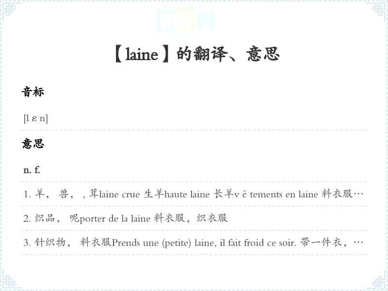 针织物, 料衣服Prends une (petite) laine, il fait froid ce soir. 带一件衣,今晚天凉。