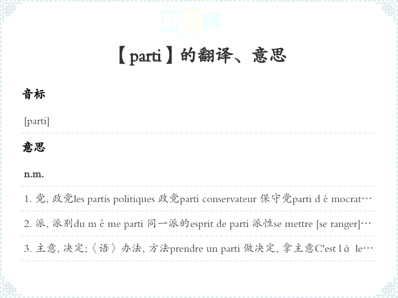 主意, 决定;〈语〉办法, 方法prendre un parti 做决定, 拿主意C'est là le meilleur parti. 这个办法最好。prendre parti 表态prendre le parti de (+ inf.) 决定(做某事)prendre son parti 打定主意;死了心prendre son parti de qch. 容忍某事, 对某事逆来顺parti pris
