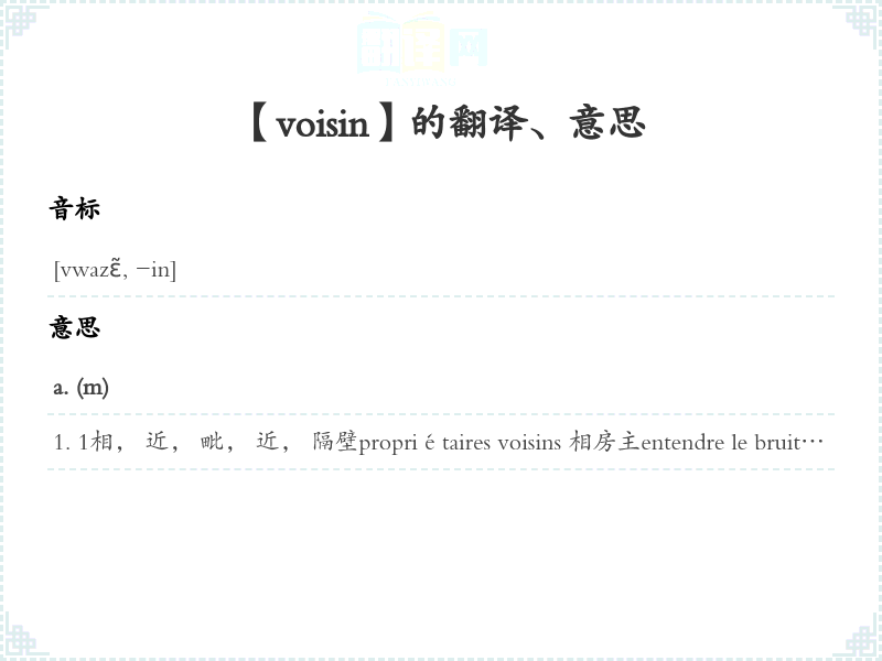 1相, 近, 毗, 近, 隔壁propriétaires voisins 相房主entendre le bruit de la rivière voisine 听到近河流水声2(时间上)接近, 临近dates voisines 距今不远日期3近似, 相似, 类似espèces voisines 相似种类des idées voisines 相似想法cette expression est voisine de la précédents 这种说法和前一种说法相似n.1居, 人; 座人, 旁边人nos aimables voisins 我们友善居fréquenter ses voisins 经常到居家串门qui a mal voisin, a mal matin <谚>居不好,天天苦恼谚>2国人se battre contre ses voisins (Voltaire)与乡人互殴 (伏尔泰)3邦, 国un dangereux voisin 危险国4他人, 别人jalouser le sort du voisin 嫉妒他人命运