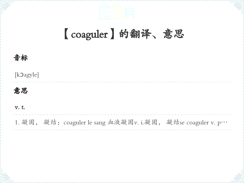 凝固, 凝结:coaguler le sang 血液凝固v. i.凝固, 凝结se coaguler v. pr.凝固, 凝结:Le lait se coagule. 牛奶会凝结。v. t.凝固, 凝结v. i. , se ~ v. pr.凝固, 凝结