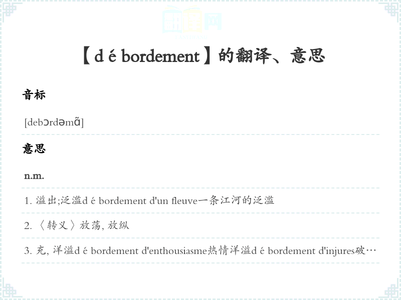充, 洋溢débordement d'enthousiasme热情洋溢débordement d'injures破口大骂débordement de paroles滔滔不绝的讲话