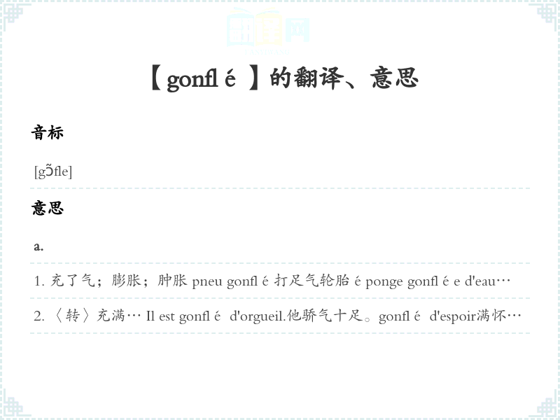 充了气;膨胀;肿胀 pneu gonflé打足气轮胎éponge gonflée d'eau吸满水海绵les yeux gonflés哭肿眼睛être gonflé à bloc〈转,民〉干劲十足,信心百倍être gonflé毫无顾忌,过分自信:Vous êtes gonflé de me raconter un pareil mensonge!您胆子够大,竟向我讲这样谎言!