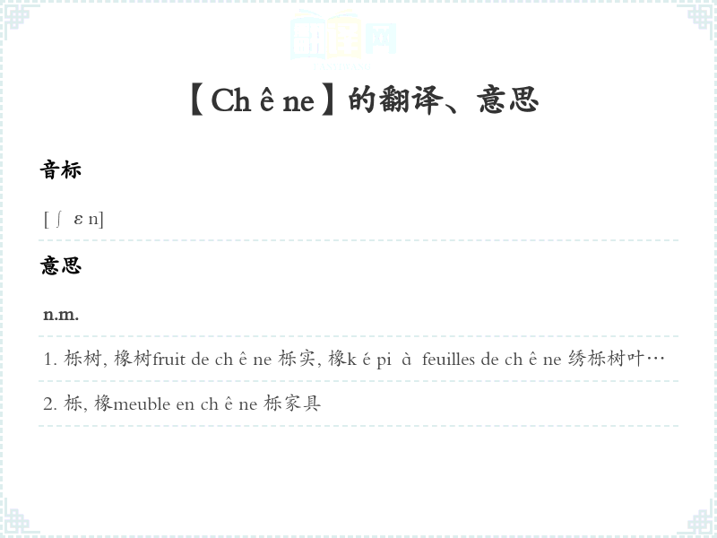 栎树, 橡树fruit de chêne 栎实, 橡képi à feuilles de chêne 绣栎树叶的军帽 [法国将级军帽]fort comme un chêne 〈转义〉十分强壮