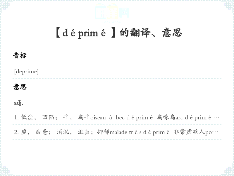 虚, 疲惫; 消沉, 沮丧;抑郁malade très déprimé 非常虚病人pouls déprimé 微脉搏marché déprimé 【经】疲软市场[指股票等]n.抑郁症患者