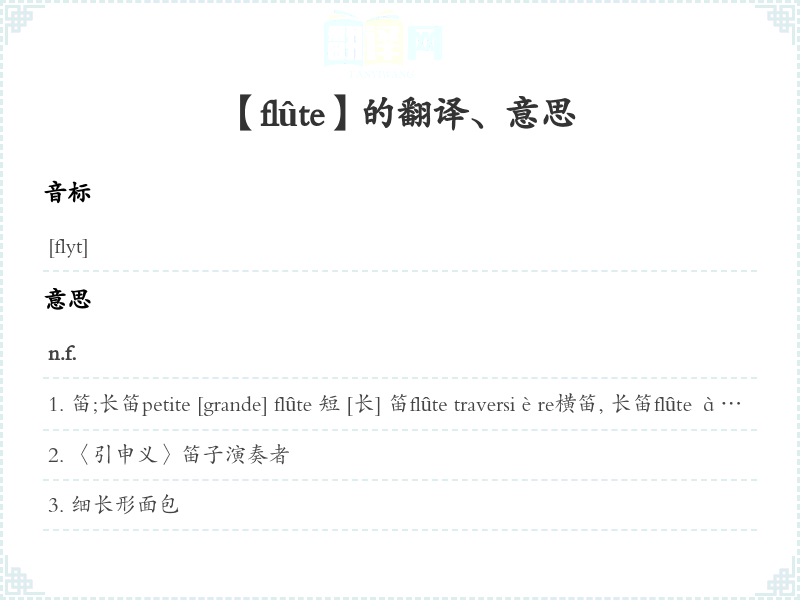 笛;长笛petite [grande] flûte 短 [长] 笛flûte traversière横笛, 长笛flûte à bec箫, 竖笛flûte de Pan排箫jeu de flûte (管风琴的)笛音音栓être du bois dont on fait les flûtes〈口语〉是个任人摆布的人;非常好说话